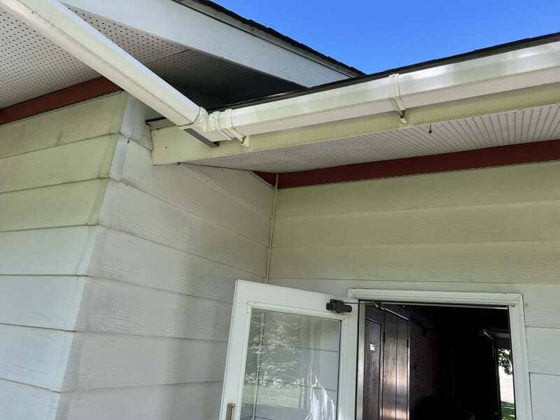 Removed existing gutters and down spouts & hauled away. Installed white 5” “K Style” seamless gutters and oversized down spouts with 3’ extensions & zip hinges.